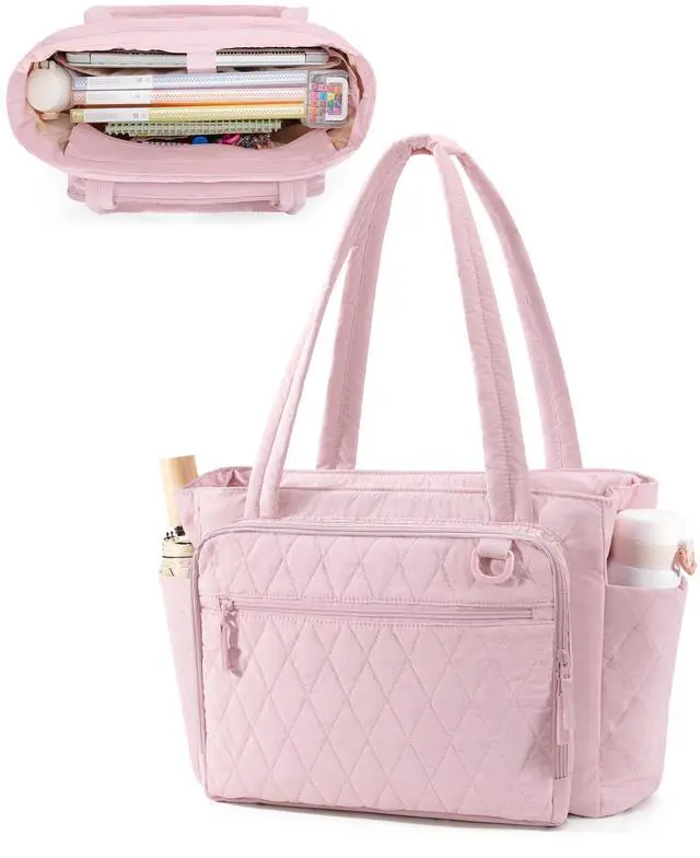 Yarwo Teacher Tote Bag with Accordion File Organizer Pocket, Ultralight Quilted Tote Bag for Women, 15.6 inch Laptop Work Handbag with Multiple Pockets for Daily Travel College Office Gym, Pink