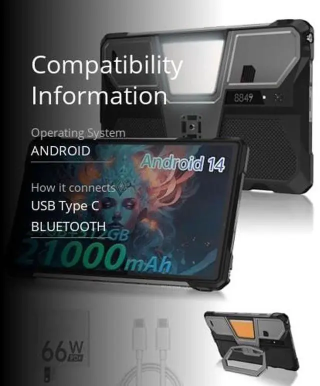 21000mAh Battery & 66W Fast ChargerAndroid 14 Tank Pad E unlocked tablet is equipped with a large 21000mAh battery, offering a standby time of up to 1100 hours, and enhancing using experiences. With its 66W fast charging, you can fully charge the tablets in just 2 hours, eliminating concerns about battery levels. The tank pad E tablet supports OTG reverse charging, it not only works as a outdoor work tablets, also can work as a power bank. Its a deal choice for entertainment and daily tasks