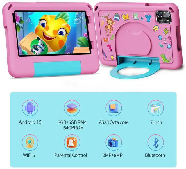 VOLENTEX Android 15 Tablets with Case 7 inch Kids Tablet, 64GB Pad for Age 3-12 Toddler, Educationl, Games, Parental Control, Built in WiFi, Bluetooth, Dual Camera (Pink)