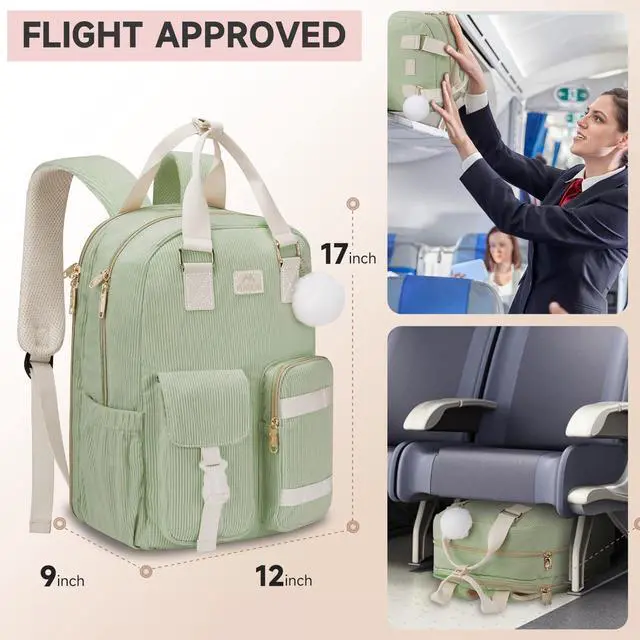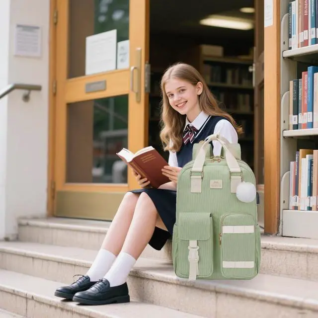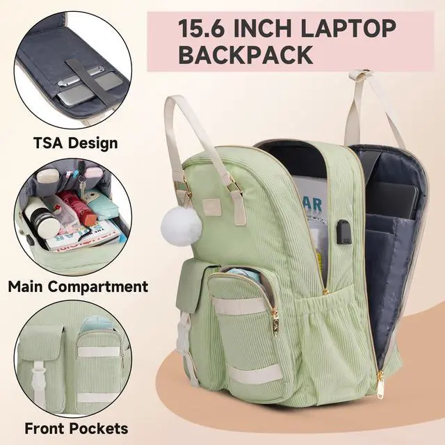 Cute & Stylish Design: This cute backpack for girls is made of soft, comfortable corduroy material, ideal for school, travel, or daily use. The detachable Pom Pom keychain adds a playful touch, and the neutral green color matches any outfit. Whether you're heading to class or a casual outing, this green laptop backpack with carrying handles offers both style and functionality. Perfect as a corduroy backpack for women or teen girls, its versatile enough for students, nurses, and teachers alike