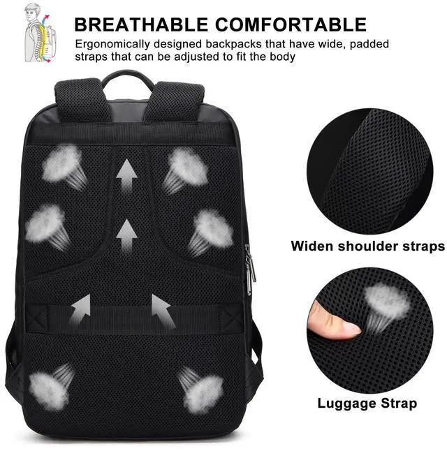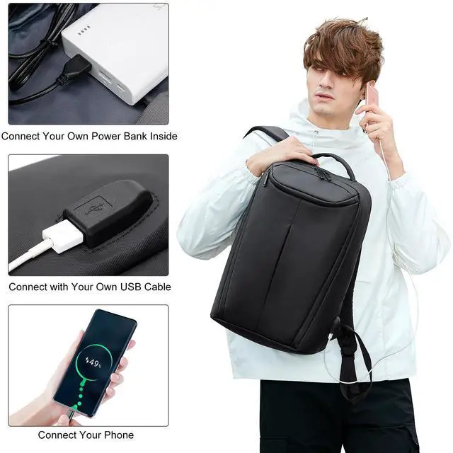 USB Charging Port:With built in USB charger outside and built in charging cable inside,this slim backpack for men gives you access to it via USB port outside on the computer bags for laptops (Power bank is not included). Free up your hands so you can use your electronic devices while walking. This slim laptop backpack is a perfect choice for everyday use or professionals on the go.