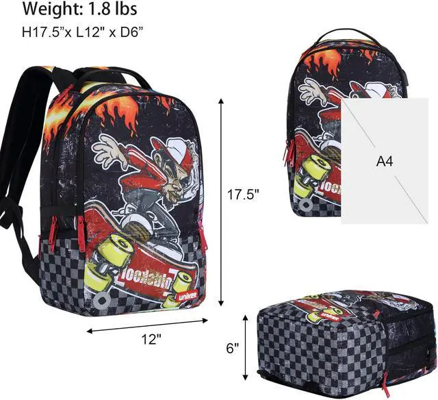 THE PERFECT BOOKBAG FOR TEENAGERS-School backpack for boys in Skateboard Boy theme.Measuring 17.5*12*6 inches,weight 0.80kg.Adjustable soft strap with buckles.Two side sealed zippers pockets.The stationery will be collected in front pocket.Multi pockets backpack for teen boys,makes your item organized and easier to find.