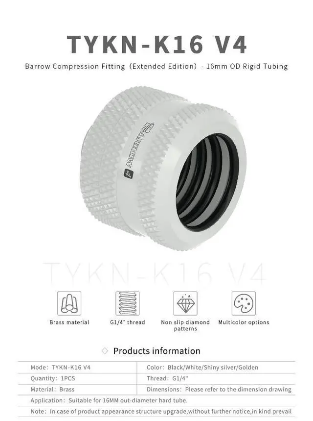Barrow G1/4" to 14mm Compression Fitting for Hard Tubing TYKN-K16 V4 4 PackRigorous selection of materials, Made of high-quality H59 brassDouble protection of surface electroplating process as well as fine texture, solid and durable. Non-slip diamond patterns, users can enjoy the touch when screwing a connector, In other words, they will boast an improved sensory experience. A standard G1/4" water cooling system interface can be compatible with other water cooling products on the marketModel: TYKN-K16