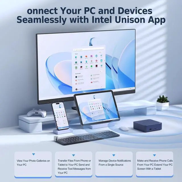 WiFi 6 provides a faster internet experience for browsing, streaming and gaming. Lower latency Bluetooth 5.2, more stable and efficient to connect to multiple wireless devices such as projector, printer, monitor, speakers and etc ^^ Intel Unison AppBeelink EQ14 Mini PC Support Connect Your PC and Devices Seamlessly with Intel Unison App, View Your Photo Galleries on Your PC, end Your PC Screen With a Tablet, Make and Receive Phone Calls From Your PC, Transfer Files From Phone or Tablet to Your PC, Send and Receive Text Messages from Your PC, viewing galleries and transfering files, reducing frequency of picking up phone during working with PC ^^ Upgraded Interface & Addition FunctionsThe transmission rate of USB 3.2 Gen2 is up to 10Gbps, 21 times faster than USB 2.0 and 2 times faster than USB 3.0, which helps you to transfer files in seconds.