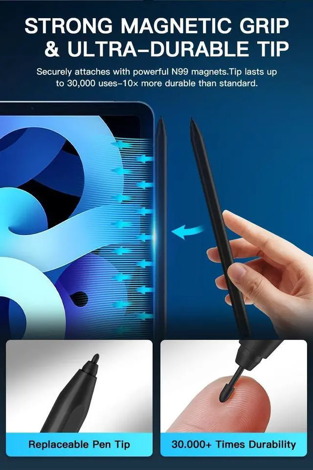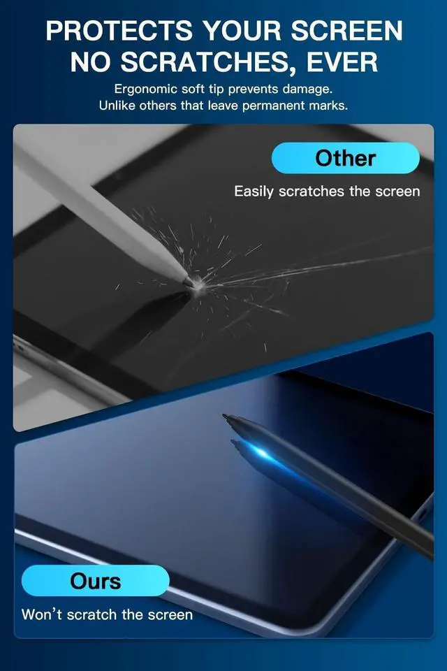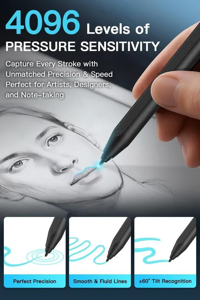Ultra-Responsive Pressure Sensitivity - Experience 4096 levels of pressure sensitivity with tilt support and palm rejection. Effortlessly capture fine details and subtle strokes, perfect for drawing, note-taking, or precision work. ^^ Durable Felt Tips - Crafted with advanced high-density fibers, each tip lasts up to 30, 000 uses10 more durable than standard stylus tips. Reduce frequent replacements and save time ^^ Soft Arc Tip Design - The ergonomic soft arc tip protects your screen from scratches while providing smooth, precise writing from any angle. ^^ Lightweight & Comfortable - Optimized for long sessions, this stylus is easy to hold for adults and kids alike, ensuring hours of effortless writing or sketching.