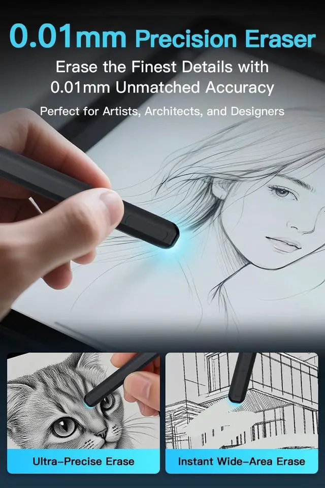 ^^ Magnetic N99 & Precision Eraser - Strong N99 magnets keep the stylus attached securely. The 0.01 mm ultra-fine eraser allows precise corrections, perfect for detail-oriented users.