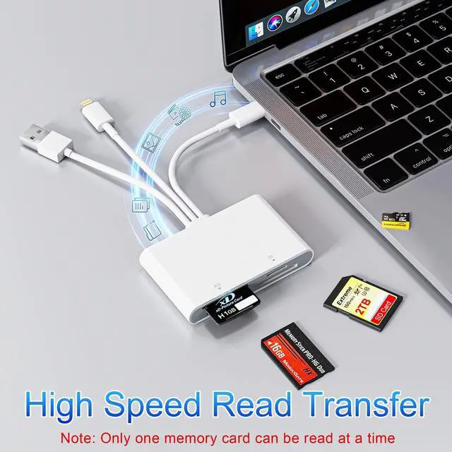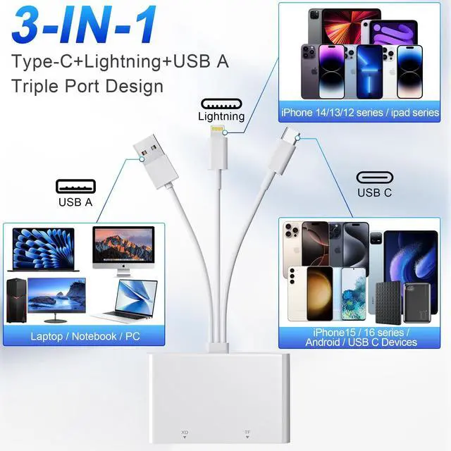 Connector Design: This Sony memory stick pro duo adapter compatible with USB-A, USB-C and Lightning ports. Simply plug the USB-C connector into devices like iPhone 16, iPad Pro, Mac, Android phones, or PCs, or attach the Lightning adapter for older Apple devices. The USB A port support more PCs. This versatile setup enables seamless cross-platform data transfers move photos, videos, and files between iOS, Android, Windows, and macOS systems with full OTG support.