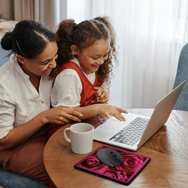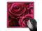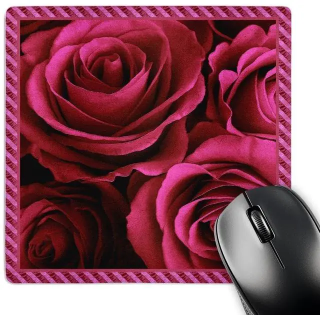 Close up scene of dreamy rich red roses surrounded by a striped frame Mouse Pad is 8" x 8" x. 25" and is made of heavy-duty recycled rubber. Matte finish image will not fade or peel. Machine washable using a mild detergent and air dry.