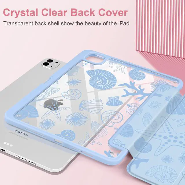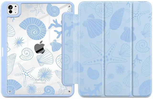 Loyrina Case for iPad Pro 13 inch (M5) 2025 (M4) 2024 Release Slim Lightweight Cute Light Blue Cover with Clear Back TPU Edge Pencil Holder Trifold Stand, Starfish and Shells