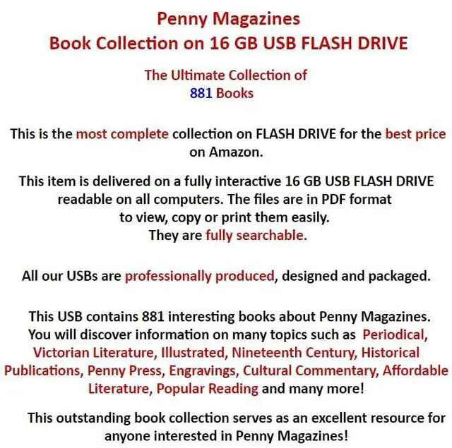 Penny Magazines Collection on 16 GB USB FLASH DRIVEThe Ultimate Collection of 881 BooksThis USB contains 881 interesting books about Penny Magazines. You will discover information on many topics such as Periodical, Victorian Literature, Illustrated, Nineteenth Century, Historical Publications, Penny Press, Engravings, Cultural Commentary, Affordable Literature, Popular Reading and many more! Many illustrations can be found and explored! This item is delivered on a fully interactive 16 GB USB FLASH DRIVE readable on all computers. The files are in PDF formatto view, copy or print them easily.