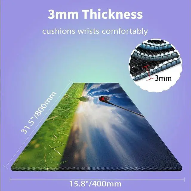 Ultra-Large Size ( 31.5" x 15.8" )Perfect for gaming setups or workspaces, covering your desk and providing ample room for keyboard, mouse, and accessories. ^^ 3mm Thick & ComfortableCushioned thickness ergonomic wrist support reduces fatigue during extended computer sessions, smooth fabric surface reduces wrist strain. ^^ Natural Non-slip Rubber BaseEco-friendly anti-slip grip keeps mat firmly in place during intense use. ^^ Ultra-Smooth Fabric SurfaceOptimized fabric surface ensures precise mouse tracking & low friction for both work and speed gaming. ^^ Stitched Edges for DurabilityExtra-large desk mat with premium stitched edges to prevent fraying, it's a long-lasting gaming mouse pad/desk mat.