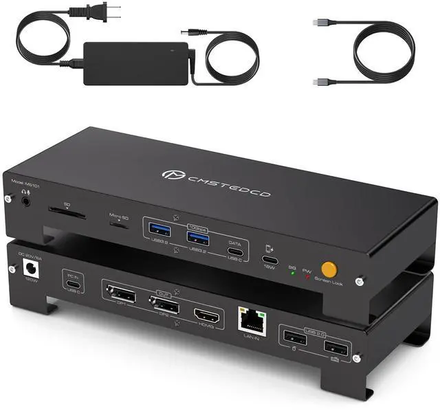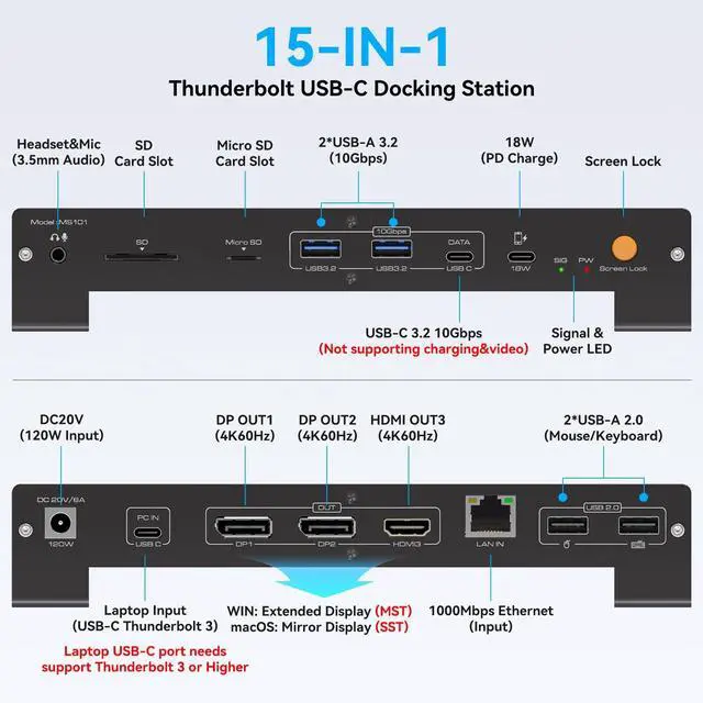 Thunderbolt Docking StationThis thunderbolt dock is for Windows laptops with Thunderbolt 3/4/5 ports, plug and play, no driver installation required. Equipped with an 100W laptop-charging USB-C port, an 18W Power Delivery USB-C port, 2 DisplayPort ports, a HDMI port, a 10Gbps USB-C data port, 2 10Gbps USB-A ports, 2 480Mbps USB-A ports, a Gigabit Ethernet port, SD/microSD card slots, a 3.5 mm AUX port, a Screen lock button and a DC20V input port ^^ Special Reminder1. MacOS only supports SST mode (mirroring mode), does not support Extended Mode.