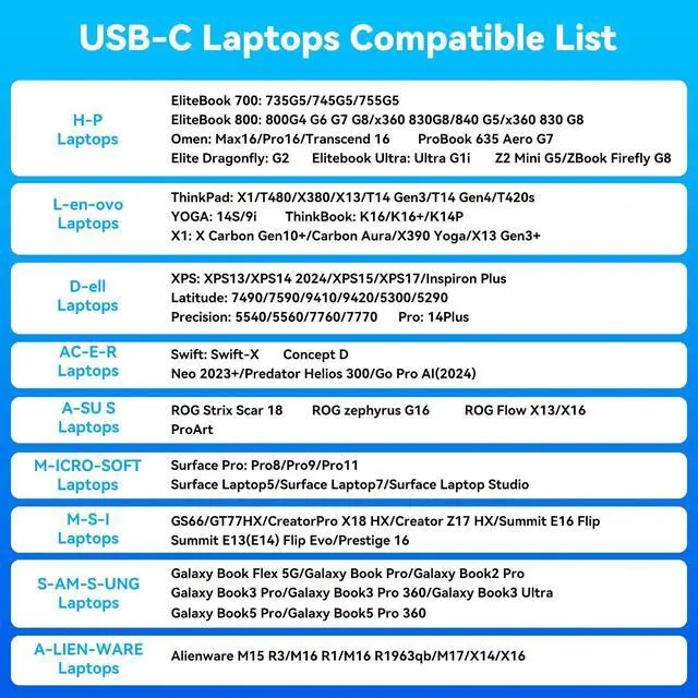 2. Requirements Your laptop's USB-C port must support Thunderbolt 3/4/5 (not regular data port). in order to use the DP and HDMI ports to output video. 3. USB C-Data port can only transfer data, does not support charging and transferring video. 18W-USB C port, only supports charging cell phones or other devices, does not support transferring data ^^ Compatible Computer ModelsThis Laptop docking station is compatible with the following series of laptops: H-P laptops - EliteBook 700/800, Omen, Elite Dragonfly, Elitebook Ultra Series; L-enovo laptops - Think-Pad, YOGA, ThinkBook, X1 series; D-ell laptops - XPS, Latitude, Precision, Pro Series; A-cer laptops - Swift, Concept D, Neo 2023+, Predator Helios 300, Go Pro AI series; A-sus laptops - ROG, ProArt series; M-Microsoft laptops - Surface Pro, Surface Laptop5/7/Studio; MSI laptops and more. Please check the second image of the product for specific models of laptops that are compatible with this product ^^ Triple Monitor Docking StationThe docking station 3 monitors can extend your Windows PC with 3 monitors via 1 HDMI and 2 DisplayPort ports, rendering up to stunning 4K@60Hz HD resolutionPlease use video cables no longer than 3.3 ft.