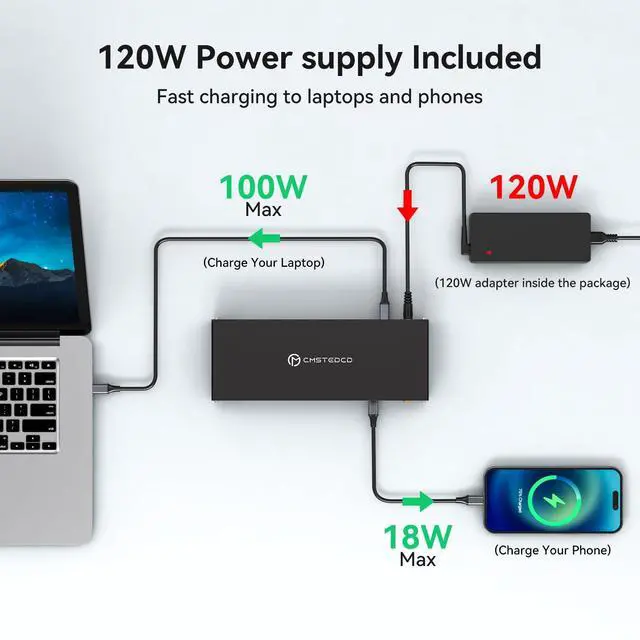 Note: MacOS does not support Extended Display ^^ Fast Charging+Screen LockThe usb c charging dock comes with a powerful 120W power adapter, no need to use your laptop's power adapter, you can charge your laptop via the docking station, the maximum input power can reach up to 100W(The more connected devices there are, the greater the power loss); and with a separate 18W fast charging port, fast charging for your cell phone (for charging only, does not support the transfer of data). Use the screen lock button to quickly lock all external displays with one click, protecting sensitive information at all times ^^ High-Speed Transfer+Gigabit Network The usb c docking station is equipped with 2 USB-A 3.2 and 1 USB-C 3.2 ports, which can achieve fast file transfer of 10Gbps, 2 USB 2.0 ports can be used to connect mice and keyboards; SD/Micro SD card slots offer fast transfer speeds of 104MB/s; Maintain secure connection through Gigabit Ethernet ports and provide stable wired network performance ^^ Accessories and ServicesThe package includes 1 laptop docking station, 1 high quality USBC-C cable, 1 set of DC20V (120W) charger (with AC cable), 4 anti-slip feet.