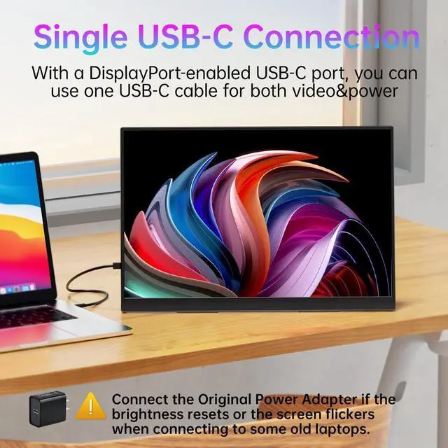 Wide Compatibility: The laptop extend monitor provides 2 USB-C ports and 1 mini HDMI port, plug and play, portable screen can connect to various devices including Laptops, Mac, PC, PS4, PS5, XBOX, etc. If your device has a Thunderbolt 3/4/5or Full-Featured USB-C port, all you need is a single USB-C to USB-C cable to connect easily. The original power adapter is recommended for sufficient power ^^ VESA and 180