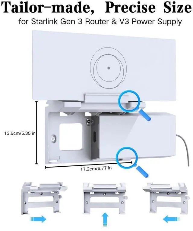 Gen 3 Router & V3 Power Supply Stand KitSpecifically designed for Starlink Gen 3, this stand kit is perfectly compatible with your Gen 3 router and power supply. It's an essential accessory for a stable and organized setup. Made of high - quality ABS insulating material, it ensures no electrical leakage, providing a safe environment for your devices. ^^ Signal OptimizationThe Starlink Gen 3 mount kit allows you to position the router at an ideal angle and location. This helps enhance the signal coverage and performance of your Starlink Gen 3 system.
