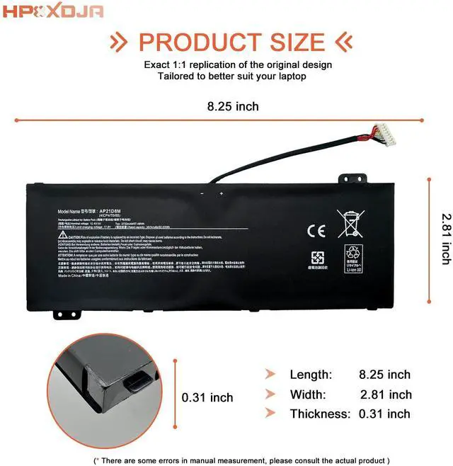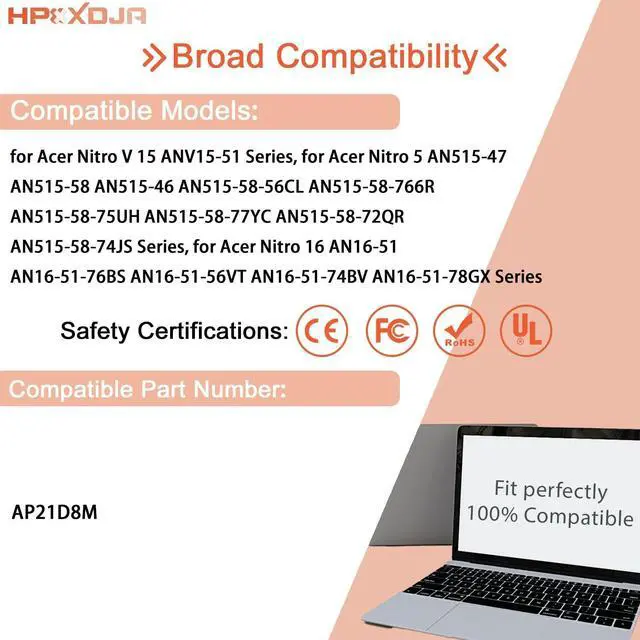WHAT YOU GET: 1 * AP21D8M battery. 1 * User Manual. 4 * Screwdrivers. ^^ Compatible with AP21D8M battery. Replacement for Acer Nitro V 15 ANV15-51 Series, for Acer Nitro 5 AN515-47 AN515-58 AN515-46 AN515-58-56CL AN515-58-766R AN515-58-75UH AN515-58-77YC AN515-58-72QR AN515-58-74JS Series, for Acer Nitro 16 AN16-51 AN16-51-76BS AN16-51-56VT AN16-51-74BV AN16-51-78GX Series ^^ Part Number AP21D8M ^^ Outstanding quality All HPXXDJA products have passed CE and UL safety certifications. Each battery has the capacity to provide enduring, continual use. Fully Safeguard your laptop and batteries.