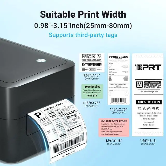 Print Clearly: This bluetooth label printer delivers 203 dpi resolution, ensuring crisp and sharp text and barcodes. This rollo label printer width support (25-80mm) and is compatible with a variety of third-party thermal label papers.