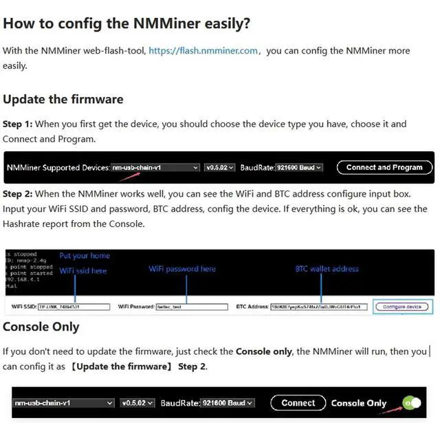 https: //flash (DOT) nmminer (DOT) com/Main FeaturesESP32-WROOM-32 Module, support Wi-Fi and BLE. Optimized Software that achieves a higher Harshrate of 960KH/s. Hashrate increases by 1750% more than other boards from rivals, which means 1750% more chances of winning.