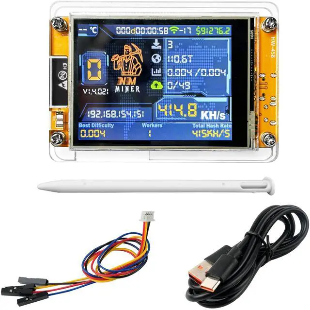 Product HighlightsSpecially optimized algorithm firmware enhances the hashrate to 960KH/s, increasing the probability of winning the lottery by 1750% (Nerdminer v2 only 55KH/s)The display will turn off after 1 minute without operation, and you can wake up the screen by pressing any key to avoid light pollution. We offer long-term support for our services, https: //t (DOT) me/NMMiner. By double-clicking the USER key, allows you to switch to a desktop clock mode with the BTC Lottery runs in the background.