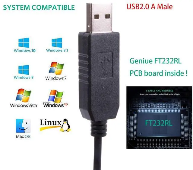 1.8 mConnector: USB to TTL Serial Adapter 4Pin 0.1" pitch Male Socket CableThis USB TLL serial converter is built with FT232RL chip, FT232RLs royalty-free VCP allow for communication as a standard COM port; a great conversion data cord to meet with your needs of debugging, boot-loading, programming, etc.