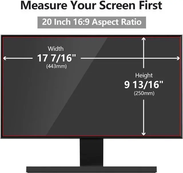 Inch Desktop Monitor- Width: 17 7/16" (443 mm), Height: 9 13/16" (250 mm), Diagonal: 20" (508 mm) - Compatible with HP, Dell, Samsung, Lenovo, LG, Acer, ASUS, ViewSonic, and other monitor brands. Please verify your computer screen's width and height measurements before ordering. It's not recommended to make your selection based solely on your computer screen's diagonal size. ^^ Easy to Install & Two Attachment Options- Simple installation, no bubbles, unlike traditional methods. Option Permanent installation method-double-sided tape sticking. uses clear adhesive strips that securely attach to any screen. Option uses slide mount tabs that easily stick to the display frame, allowing you to slide the filter on and off the screen as needed. ^^ Superior Privacy and Reduce Glare- Our advanced multi-layered film filter blacks out your screen when viewing from the side, while maintaining a crystal clear screen straight-on. This privacy screen protector is reversible (matte/glossy): Gloss surface enhances privacy, matte surface reduces reflections. ^^ Eyes Protection & Anti GlareUpgraded High-quality filter layer that can reduce blue light and UV light. Matte surface, anti-glare, intercepts part of the reflected light. Anti-scratch layer to avoid scratches from daily use. Protect your screen while protecting your eyesight. ^^ Quality ServiceYou can use it in any place where you need to protect the privacy of your screen, including offices, coffee shops, airports, airplanes, trains... Available anytime, anywhere. Pozlle provide no-hassle refund for any reason, Replacement with free replacement if cracks, defects etc. If you have any questions, please feel free to contact us.
