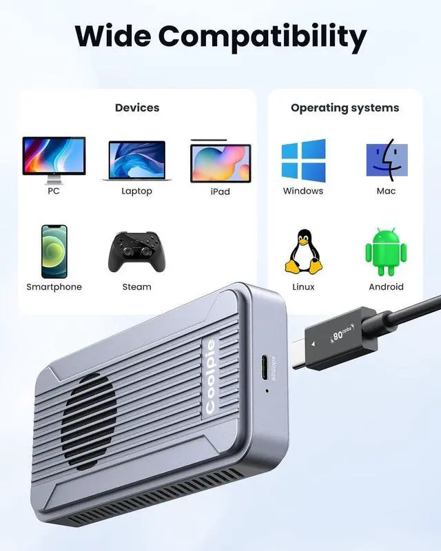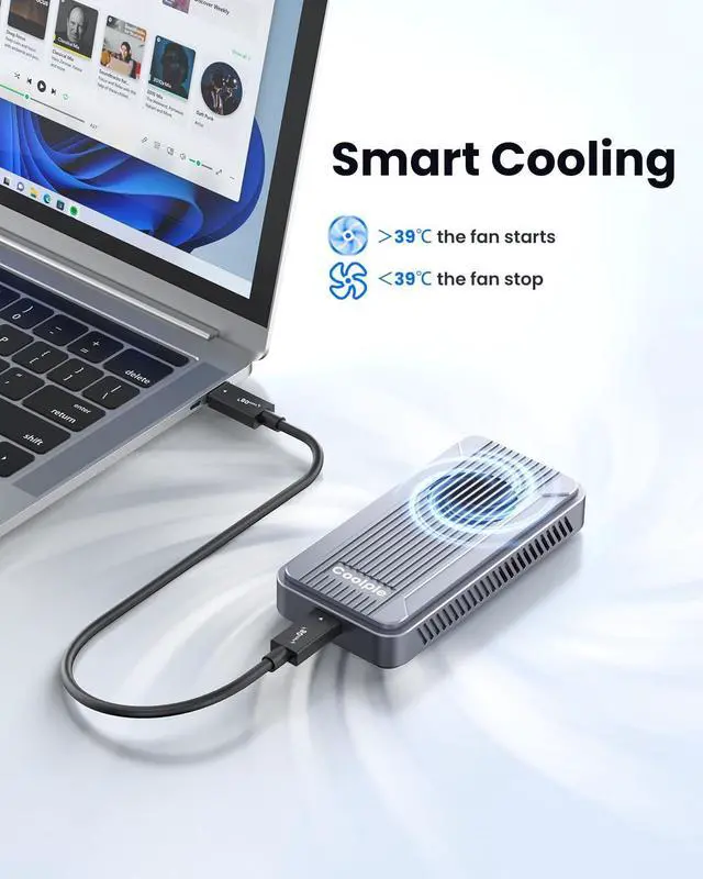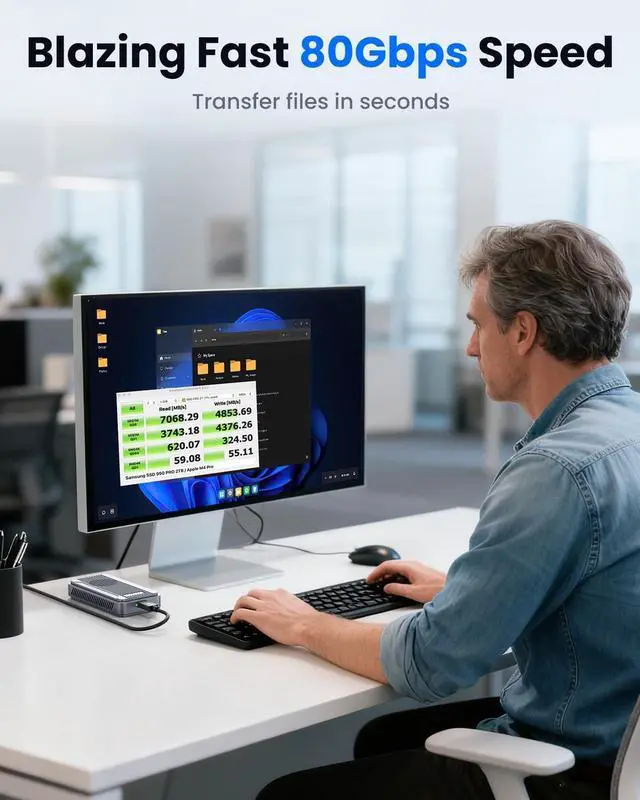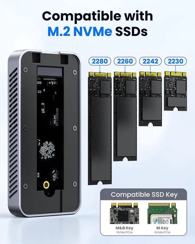 Lightning-Fast 80Gbps TransferAchieve blazing-fast 80Gbps speeds with our Thunderbolt 5 M2 NVMe SSD enclosure featuring the Intel JHL9480 chip This external NVMe enclosure delivers incredible transfer rates up to 6000MB/s perfect for large file transfers and data-intensive tasks Backward compatible with Thunderbolt 4/3 USB4 20/10 and USB 32/31/30 ensuring broad device compatibility The ideal portable storage solution for Mac M4 Pro users and professionals needing maximum performance ^^ Smart Cooling with Fan ControlExperience optimal cooling with our aluminum M2 NVMe enclosure featuring an intelligent cooling fan system The smart temperature control automatically activates the fan at 39C to prevent overheating during extended data transfers This M2 NVMe enclosure with cooling fan ensures your SSD maintains peak performance while extending its lifespan The perfect solution for continuous high-speed data transfer on your Macbook or laptop ^^ Universal Device CompatibilityEnjoy universal compatibility with our 8TB M2 NVMe enclosure supporting Thunderbolt 5 USB4 and PCIe Gen4 protocols This JHL9480 M2 NVMe enclosure works with M-Key B+M Key NVMe SSDs in 2230 2242 2260 2280 sizes Perfect for Mac OS Windows Linux and Android systems this plug and play enclosure requires no drivers for instant use The versatile external storage solution for all your computing devices ^^ Dual-Chip for Enhanced PerformanceBenefit from superior stability with our dual-chip M2 NVMe enclosure featuring Intel JHL9480 and RTL9210 controllers This advanced chipset combination ensures reliable data transfer and enhanced compatibility with NVMe PCIe Gen4 drives The aluminum external enclosure provides robust performance for Thunderbolt 5 and USB4 devices An essential tool for content creators and IT professionals demanding maximum reliability ^^ Massive 8TB Storage CapacityStore all your files with our massive 8TB M2 NVMe enclosure offering expansive storage capacity This high-capacity external drive enclosure supports PCIe Gen4 x4 NVMe SSDs for exceptional performance The tool-free installation makes it easy to create your personal storage center perfect for expanding your Mac M4 Pro or laptop capabilities The ultimate solution for gamers photographers and professionals with large storage needs ^^ Tool-Free Easy SetupEnjoy effortless setup with our tool-free M2 NVMe enclosure designed for easy installation This portable SSD enclosure requires no screws or tools for installing your NVMe SSD making it incredibly user-friendly The plug and play aluminum enclosure lets you start transferring data to your Macbook or laptop immediately Experience hassle-free storage expansion with this convenient external drive solution ^^ Compact Portable DesignTake your data anywhere with our compact and portable aluminum M2 NVMe enclosure This sleek external NVMe enclosure features a small footprint perfect for travelers and mobile professionals The durable aluminum construction protects your SSD while providing efficient heat dissipation Ideal for on-the-go data backup from your laptop or Mac with fast transfer speeds when used with compatible devices ^^ Usage Tips for Best ResultsFor optimal performance use a PCIe Gen4 NVMe SSD with this M2 NVMe enclosure and avoid PCIe 5.0 drives Thunderbolt 3 devices may experience limited speeds of 10Gbps This enclosure is not compatible with SATA NGFF SSDs or mobile phones Always safely eject the drive and use direct Thunderbolt cable connections for tablets Following these guidelines ensures the best experience with your external storage device