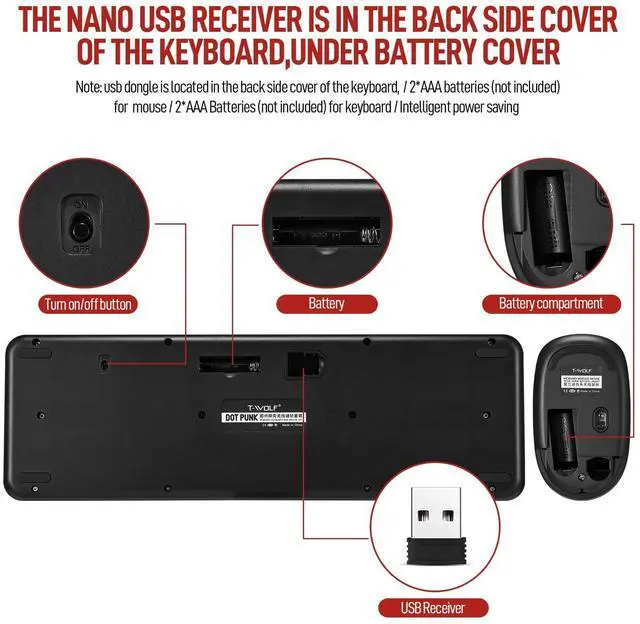 one usb Receiver Can Connect Both Keyboard and Mouse. the usb receiver to use keyboard and mouse combo or separately, without any software, driver necessary. ^^ durable keys, Free soft silicone cover will protect your keyboard from dust and scratches, The keys pressed up to 3 million times, you will fall in love with the smooth touch of the optical mouse and the matte-like surface of each key. ^^ Energy-Saving, After you stop using the keyboard and mouse combo, both of them automatically entering into sleep mode, They can go on for months without the hassle of replacing batteries.