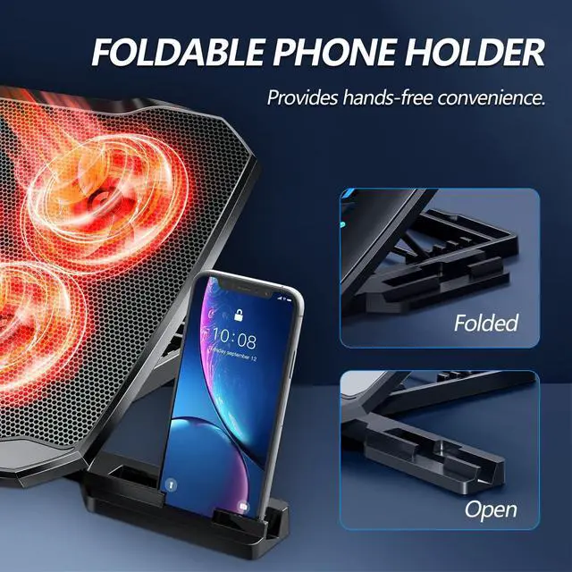 The cooling fan for laptop also includes a foldable phone holder, giving you a hands-free option for added convenience ^^ Wide Compatibility This laptop cooler cooling pad is suitable almost all 12- 15.6 notebooks, such as Dell, MacBook Pro, Alienware, ThinkPad, Lenovo, HP, ASUS, etc. It also effectively dissipates heat for tablets, routers, and gaming consoles