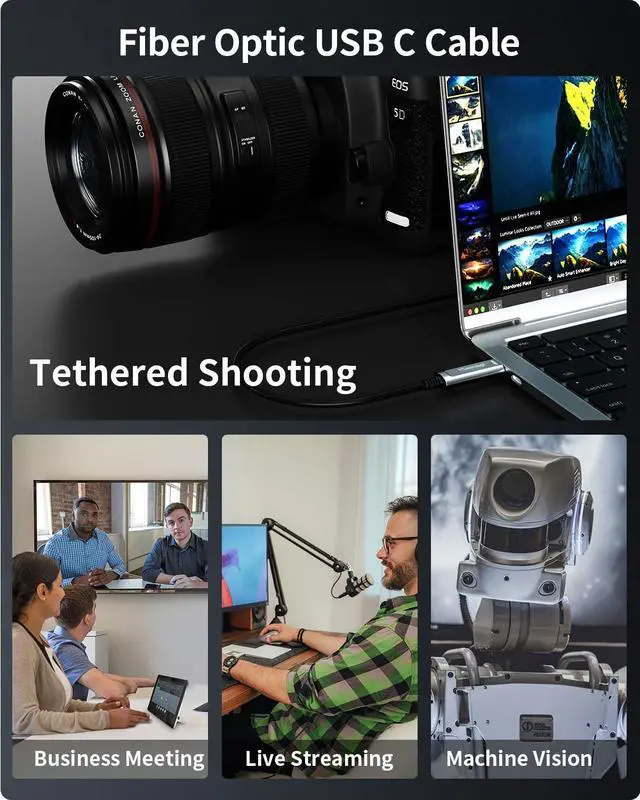 10Gbps Fiber Optic SpeedEnjoy flawless 10Gbps data transfers with our fiber optic USB C cable-3x faster than copper cables with zero signal loss. Ideal for 4K live streaming, AR/VR gaming, and multi-camera shoots where speed matters. Maintains full bandwidth across 33ft+ distances with EMI-free performance for critical applications. ^^ Ultra-Slim & Durable Fiber Optic BuildAt 4.8 mm diameter-40% slimmer than standard USB C cables-this Kevlar-reinforced optical cable snakes through tight studio setups. Survives 10, 000+ bends with military-grade connectors. Perfect for mobile creators needing portable, tangle-free solutions.