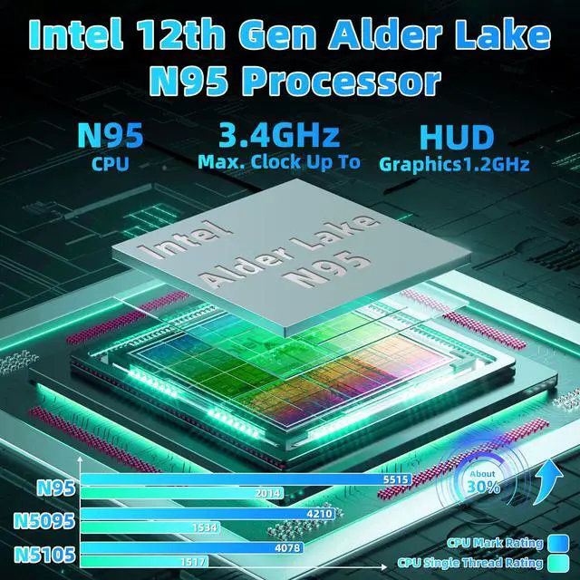 Efficient Processor: 12th-gen Alder Lake N95 CPU (4C4T, up to 3.4GH z), with powerful multi-core design, performance is much higher than Pentium N5030 and Celeron N5095. Advanced manufacturing process technology and Intel UHD Graphics 1.2GH z, which is critical for applications such as gaming, graphic design and video editing. ^^ 16GB RAM + Large