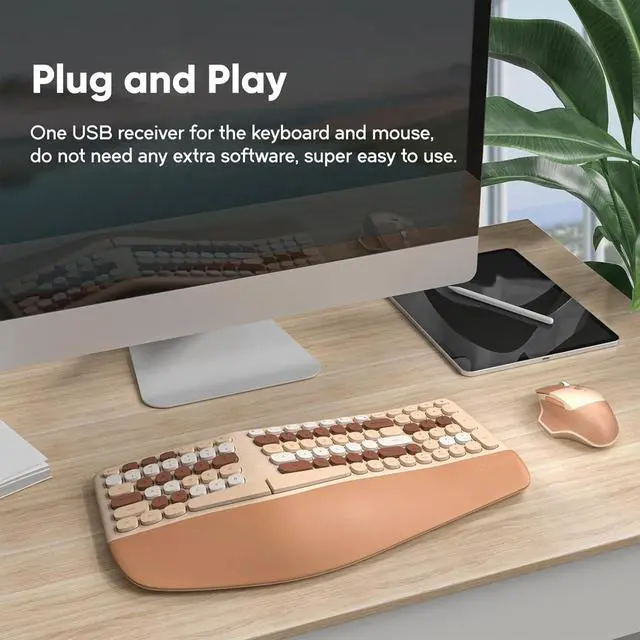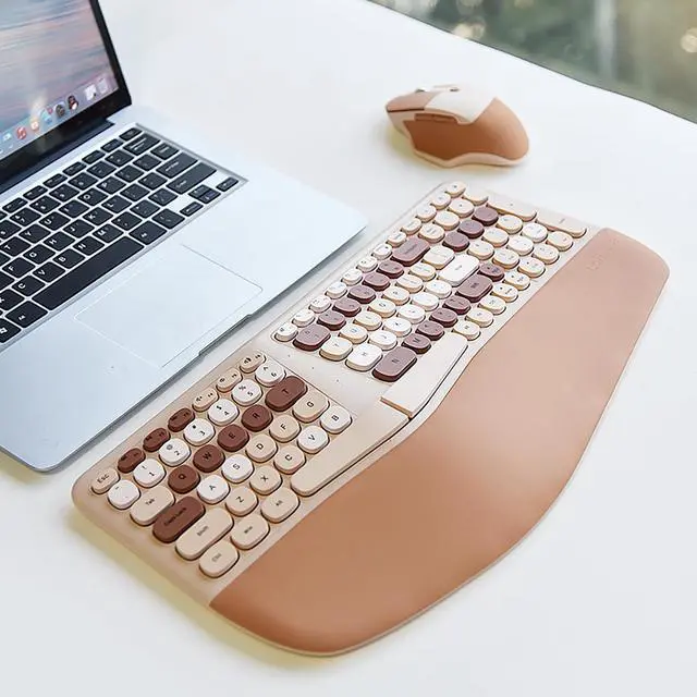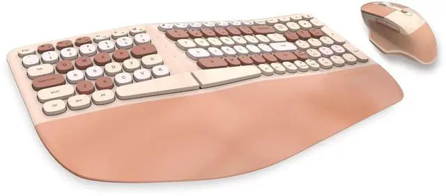 MEMBRANE ERGONOMIC KEYBOARDSplit and sloping keyboard design matches your arms and hands. The low keys can be activated with a light press, reducing typing stress. The integrated wrist rest supports your wrist in a comfortable position. This carpal tunnel keyboard allows you to type in a more natural posture, reducing muscle strain in your wrists and forearms. ^^ WIRELESS CONNECTION 2.4G wireless transmission technology, the maximum transmission distance can reach 10m. The wireless connection solves the desktop clutter problem caused by the data cable, suitable for those who like to have a neat desktop.