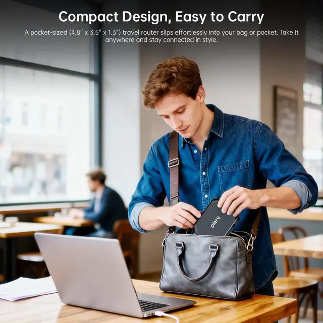 Compact Design: A pocket-sized ( 4.8 in. 3.5 in. 1.3 in) travel router perfect for your next trip. Its small size ensures easy, travel-friendly storage, an ideal gift for travelers, business and students ^^ Easy File and