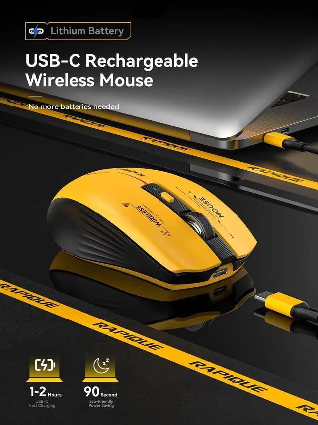 INNOVATIVE MECHA STYLE DESIGN - Experience the unique yellow and black combination that will captivate your senses, Meticulously crafted with utmost precision, this wireless mouse is a visual delight and makes for a perfect gift choice ^^ SEAMLESS CONTROL OF 3 DEVICES - Seamlessly switch between three devices with our dual Bluetooth 5.1 modes and wireless 2.4G technology. A simple click of the mode switch button located at the bottom of the mouse allows you to effortlessly transition from desktop to tablet, laptop to Macbook, iPad, and more. The green, blue, and red indication lights represent BT1, BT2, and 2.4G USB respectively, ensuring easy and convenient device connectivity ^^ RECHARGEABLE & AUTO SLEEP FUNCTION - Equipped with a high-capacity 650mAh polymer lithium battery, this mouse ensures long-lasting performance and eliminates the hassle of replacing batteries.
