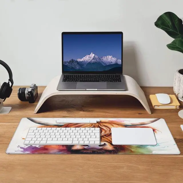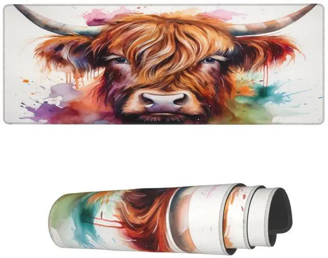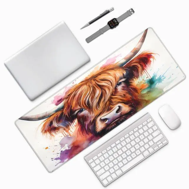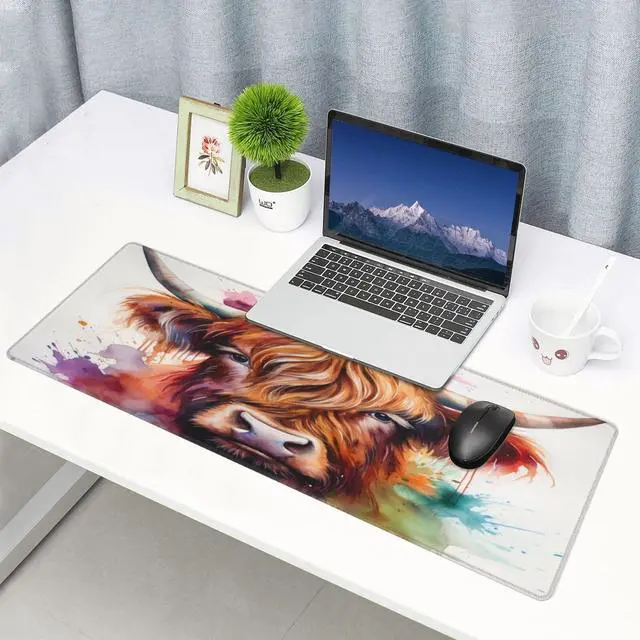 Famame Laptop Mouse Pad Cute Cow Highland Desk Mat with Stitched Edges 31.5X 11.8 inch Non-Slip Large Keyboard Rubber Writing Table Mat for Office Home
