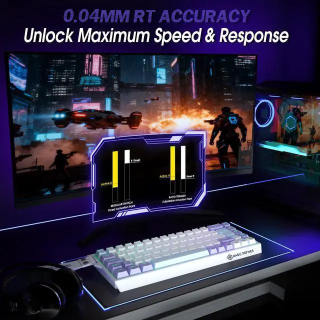 Rapid Trigger KeyboardThe MAGIC-REFINER X68HE keyboard features adjustable Hall Effect magnetic switches with customizable dynamic key triggering and rapid trigger functionality. Each keys actuation point can be precisely tuned from 0.1 mm to 3.4 mm, supporting an 8000Hz polling rate and 0.04 mm RT precision. With an ultra-fast 128K scan rate and 0.125 ms response time, this keyboard ensures zero delay and zero dead zones delivering ultra-smooth, accurate performance for professional gaming or high-speed typing. ^^ Compact 60% UK LayoutX68HE features a unique 60% UK layout that combines stylish aesthetics with high efficiency, effectively saving valuable desktop space.