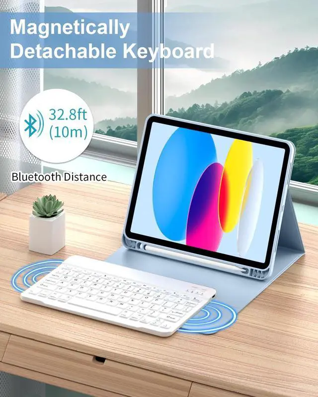 Model: A2696/A2757/A2777 ). NOT compatible with any other iPad models. Please check the back bottom of your iPad to find the model number before placing order. ^^ Long Life Battery & Magnetic Detachable Keyboard Case Built-in premium Li-ion battery with energy-saving mode, 2-3 hours full charge, work for at least 80 hours, stand by for 130 days. A spring mechanism underneath each key ensures a tactile response with every stroke, helping you to type faster and with less error than on a touchscreen. Please charge it when keyboard power indicator flashing Red. ^^ Precise Cutouts & Full Body ProtectionPrecise cutouts allow full access to all features and offer the perfect protection, convenience for daily use. Keyboard case comes with honeycomb grid pattern design is better for heat release and anti-skid. Thoughtful design to effectively extend life of your beloved iPad. Solid keyboard case and wave shock absorbtion give comprehensive protection for your new ipad 10th generation from scratches and damage. ^^ Multiple Viewing Angle and Pen HolderFor iPad Keyboard Case for 10.9" 10th Gen is magnetically attached and very versatile and the thoughtful design easily adjusts to whatever comfortable angle suits you best.
