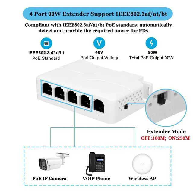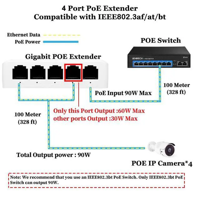 Note: 1. This Extender is not a PoE Switch, it can not work without powered from PoE Switch/PoE injector/PoE NVR. 2. Please don't place any heavy thing on the PoE extender; 3. To prevent the water seeping into the extender, please keep PoE extender away wet environment; 4. We recommend that you use an IEEE 802.3 bt PoE Switch. Only IEEE 802.3 bt PoE Switch can output 90W.