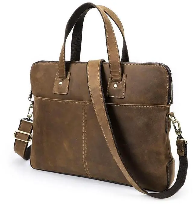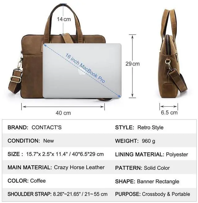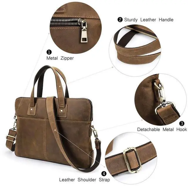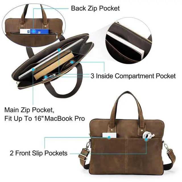 CRAZY HORSE LEAHTER - Men's messenger crossbody bag is crafted from Crazy Horse leather, with a classic vintage style. ^^ SIZE - 15.7 x 2.5 x 11.4 inch/ 40 x 6.5 x 29 cm (L x W x H). Brown leather bag can fit up to 16 inch laptop computer. Premium leather business pack is ideal for lawyers, professors when travel/work. ^^ MULTI COMPARTMENT LAPTOP BRIEFCASES - 1 main zipper pocket can hold in 16" Laptop, 3 inter open pocket, 2 front pouches and 1 back zip pocket. ^^ Leather messenger briefcase for work is a gift for father, husband, brother, son, famliy on Valentine's Day, Fathers Day, Thanksgiving, Christmas, New Year ^^ NOTE - Crazy Horse leather is prone to creases or scratches, this is not a quality issue.