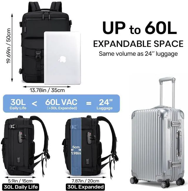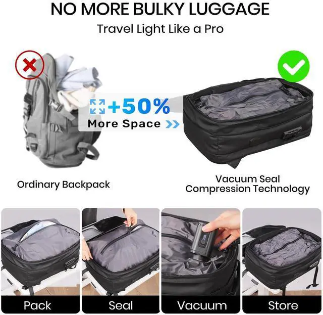 Space Saving: Our backpack Supports manual and electric one-touch pumping, easily compresses volume and saves up to 50% space. Instantly expands to an impressive 60 litres when needed. ^^ Durable Materials and