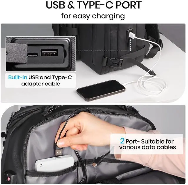 USB Port Dual Interface: Our backpack is equipped with Type-C, Type-A two charging dual interface, you can put the charging treasure in the bag, through the backpack charging port charging, travelling can free your hands.