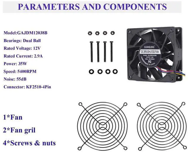 ^^ Advantage: 55, 000 hours at normal temperatures, longer than sleeve bearing fan, long lifespan and excellent heat dissipation performance; high speed 5400 RPM fan, high airflow 230CFM fan. ^^ Package include, 1Pcs axial flow fan, 2pcs grills, 4pcs screws & nuts. ^^