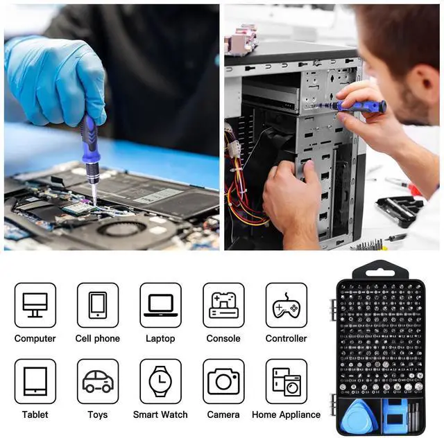 Variety & Wide Application 124-piece screwdriver set includes 101 premium qualtiy chrome vanadium steel 4mm precision bits, complete with every driver bit head you'll need to repair any electronics, such as for computer, tablet, mobile phone, PC, laptop, Mac, playstation 5/4/3, Xbox series game console & controller, iPad, RC toys, Watch, Eyeglass, etc. ^^ Utility Tool KitThis computer tool kit offers maximum utility with 23 practical repairing tools. Eg. Fexible extension shaft is 360bendable, perfect for removing fasteners in tight space.
