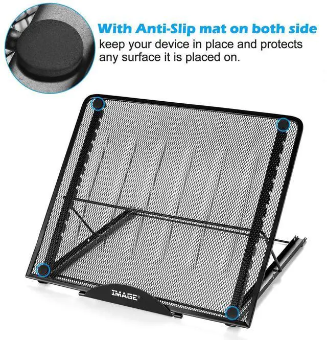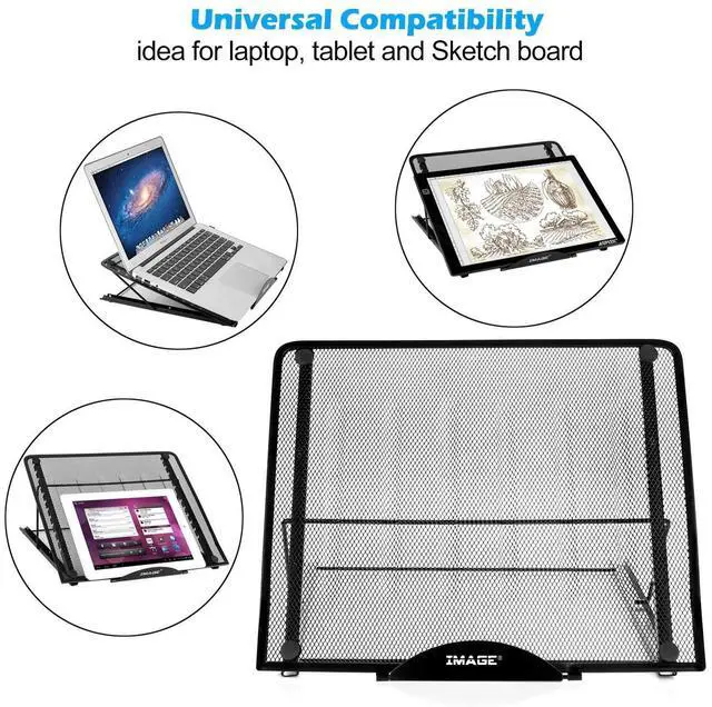 Can be used with light box sketch board/ laptops / iPad / tablets/notebook and more. High Quality, Strong metal, light weight and sleek in design, easy to carry. ^^ Ventilated laptop/light box stand helps to keep your laptops/light box/sketch board running cooler to help prevent hardware damage. ^^ Mesh metal platform helps to draw heat away from light box / laptop / tablet /sketch board. ^^ Adjustable height (12 positions) for increased airflow and comfortable viewing, reading, drawing and typing.