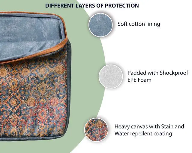 These 100% Cotton laptop bags are made of high quality canvas fabric, which is slim and spacious bags made of solid materials and eye-catching patterns. It helps to protect laptop from dreaded knocks, spills, bumps, dings and accidental scratches. ^^ Our printed laptop bags have stain and water repellent finished outer case. A roomy interior fitted with 6mm EPA foam sheets all along and lined with soft cotton inner lining to cradle your laptop. YKK zippers for easy and quick access to all other essentials. ^^ Loaded with handy features like trolley sleeve, easy-to-access yet secure compartments for your phone, wallet, and well-appointed zip closure compartments that open up to slip pockets and pen loops to keep your Earpods, mouse, laptop charger and other essentials neatly stashed away.