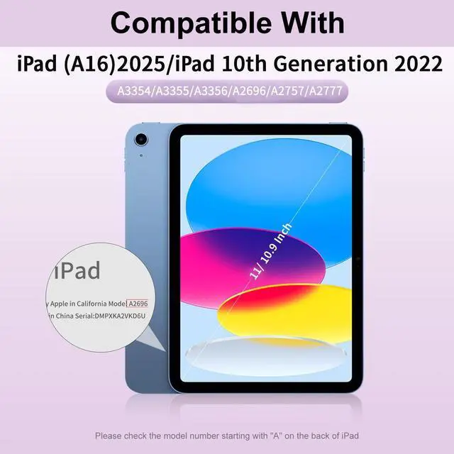 Keyboard case for iPad 11th/10th generationSZPSGC iPad case with keyboard is designed for iPad (A16) 11th generation 11 inch 2025 (Model: A3354/A3355/A3356), iPad 10th generation 10.9 inch 2022(Models: A2696/A2757/A2777). Not for any other models. Please check the model number No. "AXXXX" the bottom of the back of your tablet to confirm correct size before purchasing this iPad case ^^ Magnetically Detachable KeyboardFor iPad 11th/10th gen keyboard is magnetic and it can be strongly attached to the case or detach completely. When you do not need the keyboard can be stored away, easy to carry it on the go. It is easy, fast and stable to connect via bluetooth, reconnect immediately turning it on ^^ Backlit Keyboard for iPad 11th/10th GenThe iPad 11th/10th generation case with keyboard allow you easily switch between adjustble 7 RGB pure backlit with 3 levels brightness with a shortcuts is customized for your tablet, engaging yourself in a free and relaxed typing experience in any dim condition ^^ Multiple Viewing AngleThe iPad A16 11th generation case, iPad 10th Generation 10.9 inch case for drawing or writing on, do more computer, suitable for home, office or school use drawing or writing on, for there are 3 anti-slip grooves design inisde of the iPad 11/10th generation case 11/ 10.9 inch 2025/2022 provides the perfect stand angle, you can change where the tablet is on the iPad case and adjust the screen angle this way ^^ Powerful Power and Multi-FunctionsOur iPad (A16) 11th generation case/ iPad 10th generation case with keyboard built-in powerful power and enters energy-saving mode automatically if not in use for long time, which worry-free use and long standby time.