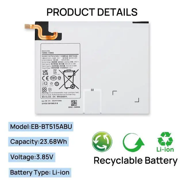 ^^ More Capacity: EB-BT515ABU; Li-Polymer, Volts: 3.85V, Capacity: 6150mAh/ 23.68W h. Comes with a complete set of tools as shown in the picture to make it easier for you to install.