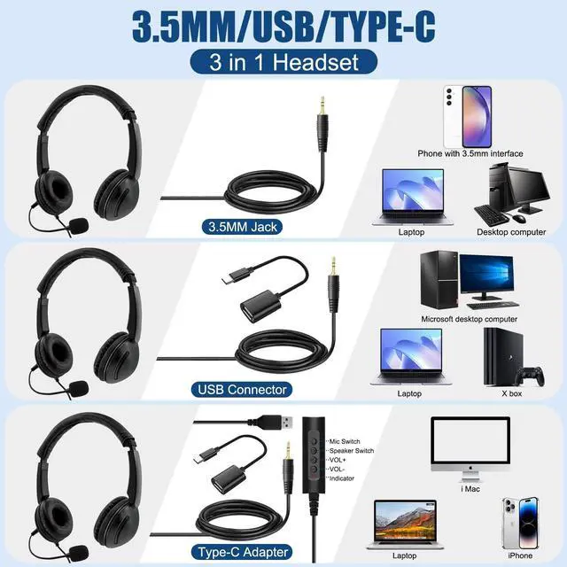 3 in 1 Headset - Plug the USB-A connector into your computer without the need of driver software. The 3.5MM jack is compatible with all desktops, PC or smartphones that have a 3.5mm port. Particularlly, the type-c plug works with Macbook laptops or App