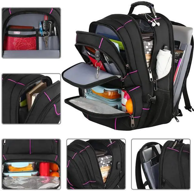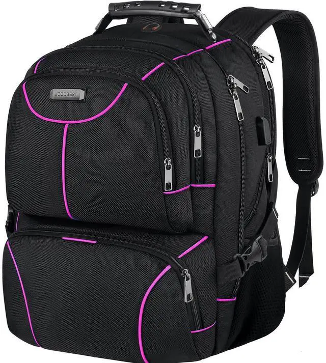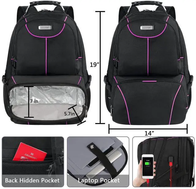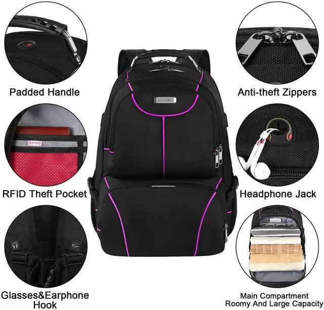 & RFID ANTI-THEFT: Unfolds the extra large backpack freely 90-180 degree making you quickly through the airport security and keep items tidy, Designed for airplane traveling. The big backpack for indoor/outdoor activities, Served as college laptop backpack. RFID Pocket with RFID-radio frequency identification help secure personal data encoded on you credit cards, IDs and passports. The anti-theft pocket on the back of backpack, easy to put your phone, purse and passport. ^^ Back Luggage Strap & Chest Strap: Back U-shaped ventilation design help for the air convection. Adjustable shoulder straps with padding help relieve the stress from your shoulder. A luggage strap allows backpack fit on luggage/suitcase, slide over the luggage upright handle tube for easier carrying; The Adjustable chest strap bring the shoulder straps in tighter to the chest. Also, the college backpack with a sturdy rugged handle with steel cable on the top for carrying.