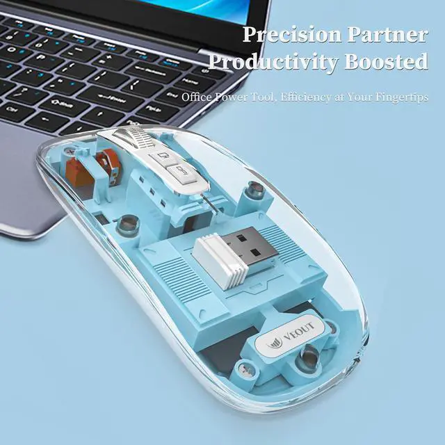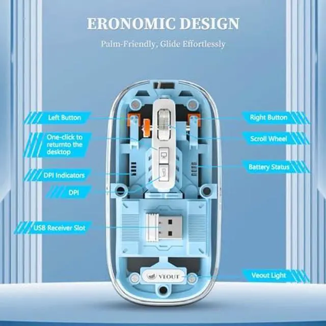 Magnetic Transparent CoverMechanical Visual Design Removable transparent top cover with strong magnetic adsorption, revealing precision gear structures inside. Real-time battery percentage display merges mechanical aesthetics with functionality. ^^ 3-Step DPI AdjustmentMetal Scroll Wheel Cycle through 800/1200/1600 DPI via tactical metal scroll wheel. Diamond-cut buttons + carbon-fiber textured grips ensure precise control across interfaces. ^^ Silent SwitchesIndustrial Desktop Key Built-in silent mechanical switches reduce click noise. CNC-milled steel "Desktop Key" minimizes windows instantly (Windows/macOS adaptive) for efficient meeting transitions. ^^ Tri-Mode Device Hub Connect three devices simultaneously (phone/tablet/PC) via Bluetooth 5.2 + USB receiver.